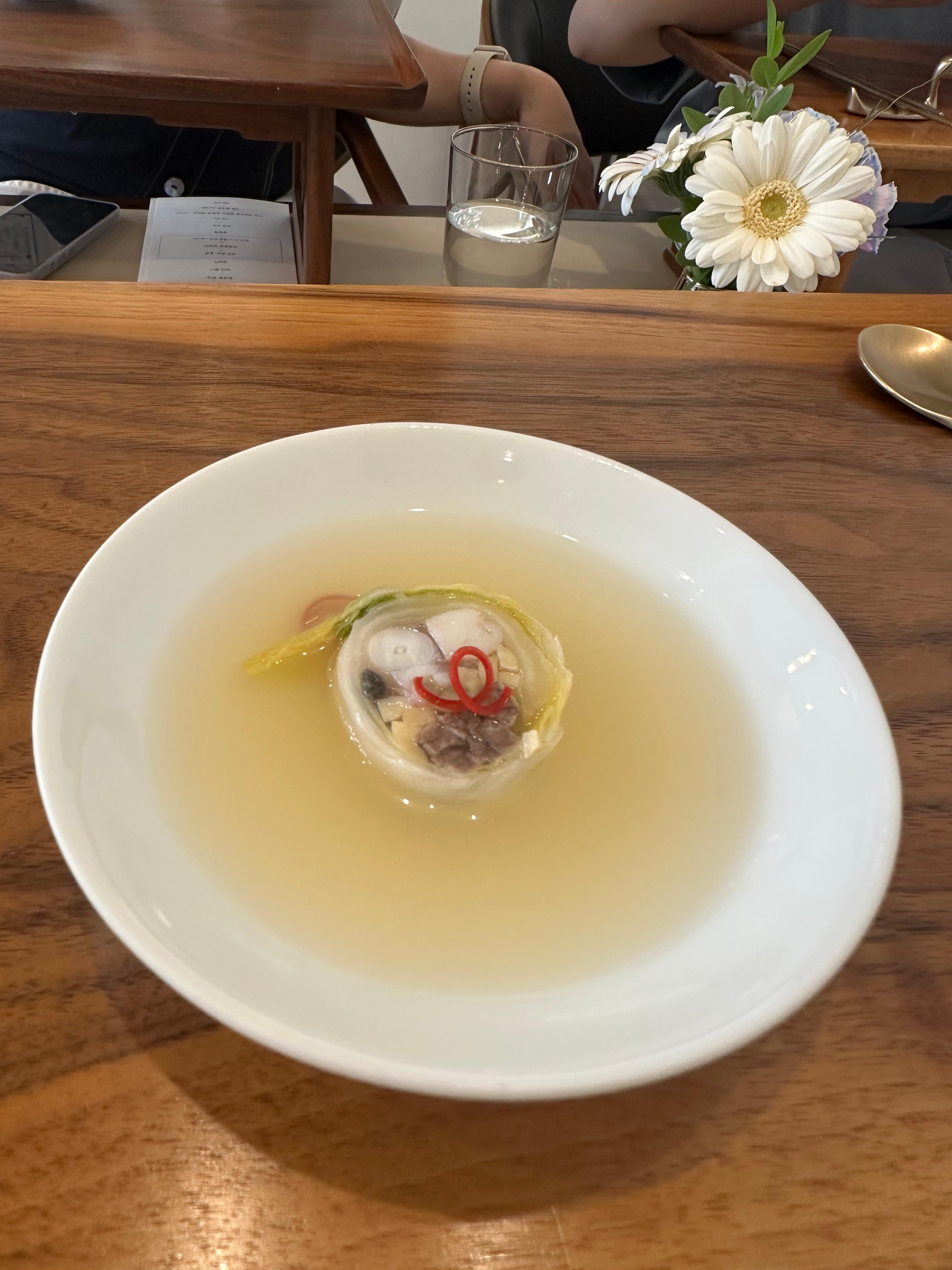 술찜한 민어 위에 멍게젓과 조개 관자가 곁들여져 있고, 바지락 육수가 곁들여진 메인 생선 요리입니다.